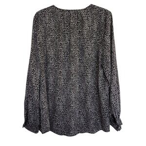 The Nine West Button Down Front Long Balloon Sleeve Dressy Blouse in XXL is a stylish and versatile careerwear piece perfect for polished casual occasions. The black and white polka dot pattern, V-neckline, and balloon sleeves add a touch of fun and flair to the classic button-up design. Made of lightweight polyester fabric, this blouse is easy to care for and ideal for the fall, winter, and spring seasons. With a regular fit and featured accents like buttons, this blouse from Nine West combines comfort and style effortlessly, making it a wardrobe staple for any fashion-forward woman.