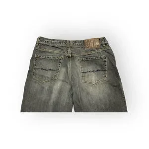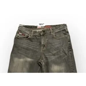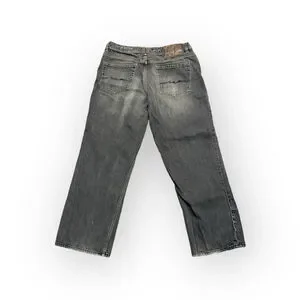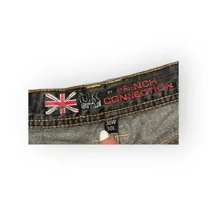 These are pre-owned UK Style by French Connection jeans, size 36W 30L. The jeans are made of gray denim material and feature a standard five-pocket design. The waist measures approximately 16.5 inches, and the inseam is about 28 inches. There is a logo patch on the front and back. The leg opening is 9 inches. The jeans show signs of wear, with fading throughout and minor fraying on the hems.