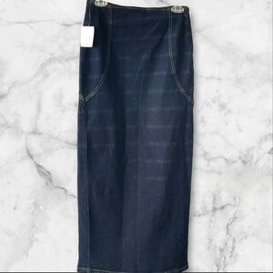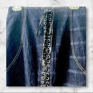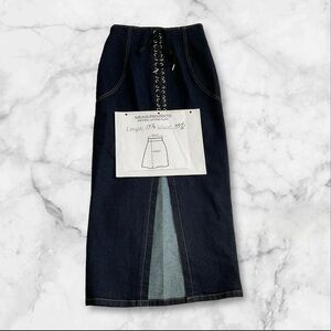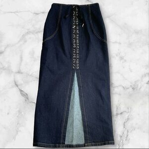 Forever 21 Maxi dark wash blue denim skirt, rivet corset tie, front split, straight, side zipper. SZ S - NWT