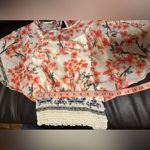 Papaya Floral Blouse. Size Small. Sheer. Built in tank. Elastic waist. Flowy arms. Open tie back. Red, blue, white. Great condition. See pictures for details.