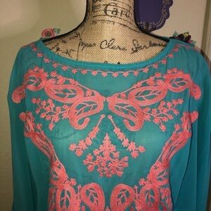 Karlie Sheer Turquoise & Embroidered in Coral Kimono Sleeve Blouse Size M