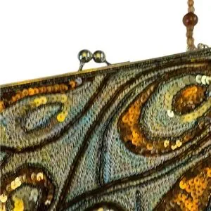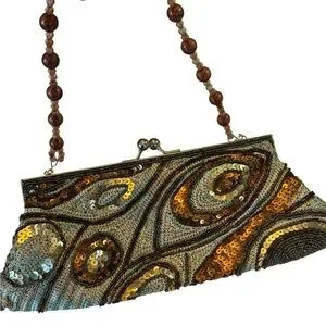 This stunning clutch features a unique sequin design with a beaded handle, perfect for adding a touch of elegance to any outfit. The gold and brown tones create a sophisticated look.