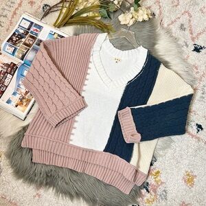 POL Nadene Beachy Color Block V Neck Flare Sleeve Cable Knit Chunky Sweater Sz M