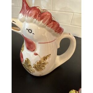 This product consists of three hand-painted chicken rooster pitchers from Deruta, Italy. Made of ceramic using traditional pottery techniques, these vintage original pieces feature a multi-color design with a painted backstamp. The beautiful craftsmanship and unique theme make them a charming addition to any kitchen or dining room decor. Perfect for collectors or those looking to add a touch of rustic Italian style to their home.