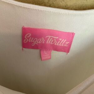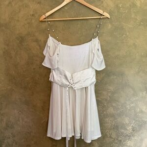 Sugar Thrillz by Dolls Kill Timeless Love Pearl mini dress. Attached satin corset with pearls, adjustable ties in back. Chain and pearl straps with draped off the shoulder ruffled mini sleeves. Cowl neck. Lined. Fabric has stretch and has a beautiful iridescent sheen to it.