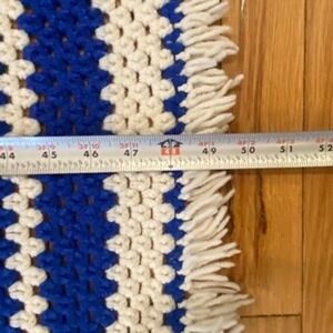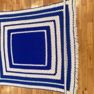 Hand crocheted blanket in classic blue and white granny square pattern. This charming throw features a central blue square surrounded by concentric rings of white and blue crochet work, finished with a playful fringe border. Perfect for adding a cozy, vintage touch to your living room or as an extra layer of warmth on a chilly evening. Ideal for snuggling on the sofa or adding a decorative accent to a reading nook.