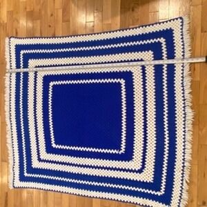 Hand Crocheted Blue White Granny Square Blanket Throw Fringe
