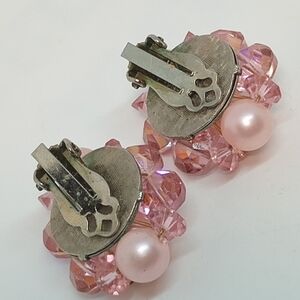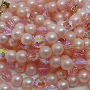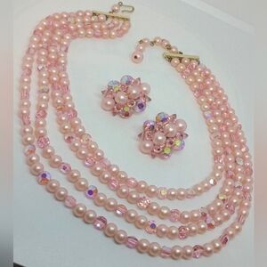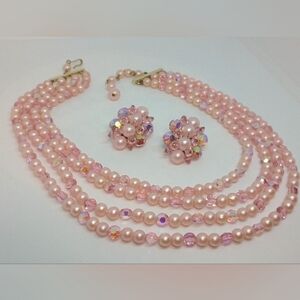 * Vintage Pink Aurora Borealis & Faux Pearl Necklace & Clip On Earrings SET