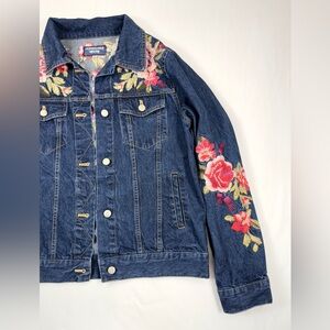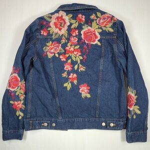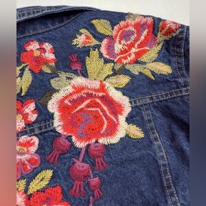 This Johnny Was Workshop embroidered denim jacket is a stunning statement layer with richly detailed floral embroidery throughout. Crafted in classic blue cotton denim, this jacket features bold rose motifs across the front yoke, sleeves, and an eye-catching cascading floral design across the back. The embroidery showcases vibrant reds, pinks, and soft greens for a romantic bohemian aesthetic.