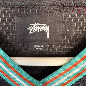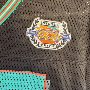 The product is a Stussy Tribe 35th anniversary football jersey in size L. It is a black T-shirt made of jersey fabric, designed for men in a regular size fit. This limited edition shirt celebrates the brand's anniversary with a unique design that pays tribute to the classic Stussy style. Perfect for fans and collectors looking to add a special piece to their wardrobe.