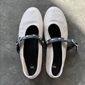 In almost brand-new condition. Worn 3 times I think. Super comfortable. I have these in other colors and wear them all the time. Size 39. I’m usually a US 8.5 and these fit perfectly. I’m not 100% sure if they are fully leather, even though Zara lists them as leather.