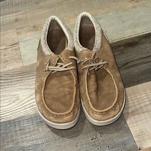 Experience effortless style with Hey Dude loafers, featuring a soft tan and brown suede finish. These slip-ons boast a moccasin-like construction with decorative laces and a comfortable low-cut collar. Perfect for casual outings, they offer a versatile look with a durable white rubber sole for reliable traction.