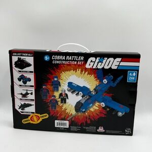 29The GI Joe Cobra Rattler Construction Set is a brand new toy by Hasbro with 224 pieces, featuring characters from the GI Joe franchise. This set includes a utility vehicle modeled after the Rattler from the GI Joe movie, with a blue color scheme and a 1:18 scale. The plastic pieces are designed for children aged 5-7 years, perfect for fans of military and adventure-themed toys.