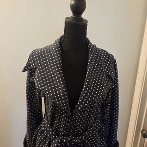 Stylish blue zip up coat with white polka dots. Features long sleeves and a belted waist. Elegant and versatile. This has been a favorite coat for me. I don't see any true flaws but the coat does show some aging, some of the polka dots show wear. It's a comfortable and versatile coat and a wonderful addition to any wardrobe.