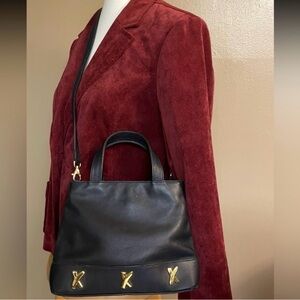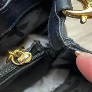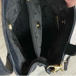 Inner Pockets, Center zipper section, inner Cloth Lining and Snap Closure. Signature Triple Gold X Accents line the lower part of bag and Designer Autograph/Signature on bottom. Measurements in photos. *there is a small inner tear ~ center pocket has pulled away from the inner lining.* Minimal Wear