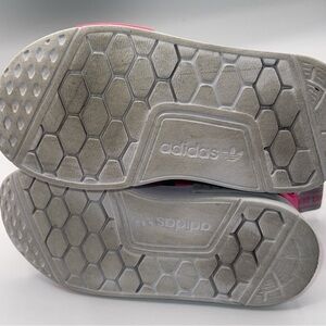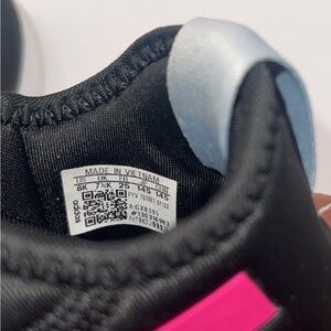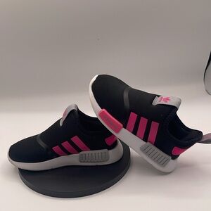 These Adidas sneakers boast a striking black and pink color scheme, featuring a modern silhouette and a snug, sock-like collar for a comfortable fit. The vibrant pink accents add a bold touch to the predominantly black mesh upper, making them perfect for both athletic and casual wear.