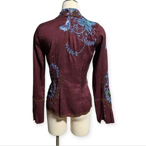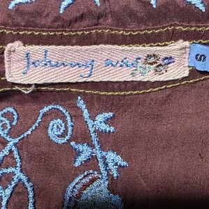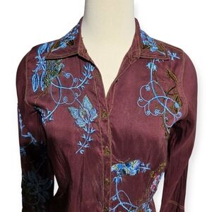 This blouse is a vintage Johnny Was silk embroidered butterfly shirt. The shirt is a rich chocolate brown color with vibrant all-over butterfly and flora embroidery in blue and green. Johnny Was is a brand known for its beautifully crafted vintage-inspired clothing.
