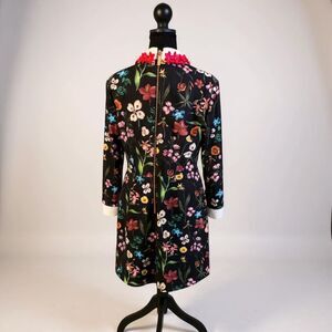 Pattern: Vibrant floral print with 3-D appliqués on collar
