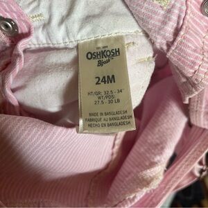The product is a vintage Osh Kosh pink and white striped shortalls in size 24 months for a toddler girl. Made of 100% cotton denim, these one-piece overall shorts are machine washable and perfect for travel or casual occasions during the summer, fall, and spring seasons. The retro style and classic multicolor stripes make them a stylish addition to any little girl's wardrobe, especially for those who appreciate the OshKosh B’gosh brand and quality craftsmanship.
