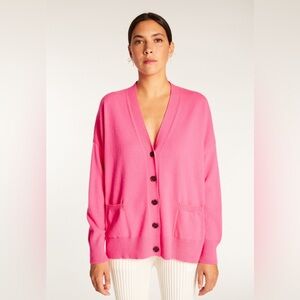 Bright pink cardigan with button front. Features two front pockets. Ideal for layering.