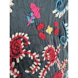 Color: Dark teal base with multicolor floral and geometric embroidery in red, blue, pink, yellow, and cream.