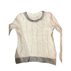 Anthropologie Moth Cream Silver Knit Sweater. Pointelle knit, knitted and knitted. Cream color with crew neck, silver metallic around collar and bottom band and wrist cuffs. Wool blend