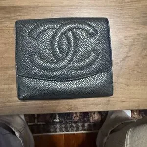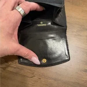 Sophisticated CHANEL wallet in textured black leather. Features iconic logo design. Compact and stylish.