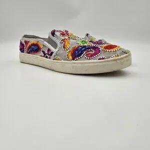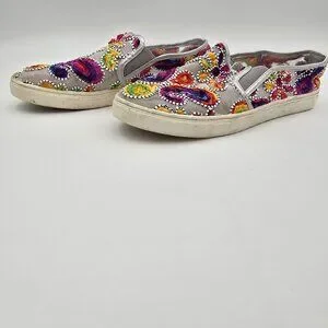 women sneakers, slip-on shoes, casual footwear, colorful embroidery, Wanted brand, pre-owned sneakers, summer shoes, canvas slip-ons, flat shoes, multicolor sneakers, embroidered shoes, casual slip-ons, size 9.5