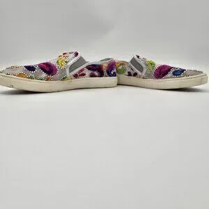 Wanted Women's slip-on sneakers, size 9.5, showcasing bold multicolor embroidery on a textile upper. Features comfortable elasticated sides for easy wear. Pre-owned with some dirt marks on soles.