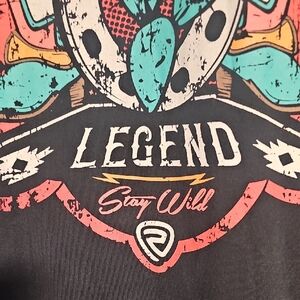 Black t-shirt with a colorful Western Legend graphic. Features vibrant designs in red, blue, and yellow.