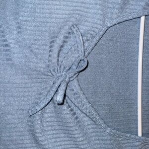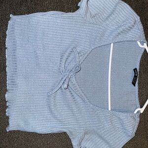 Chic sky blue crop top with ribbed texture. Features a stylish tie-front and ruffled sleeves. Ideal for casual wear.