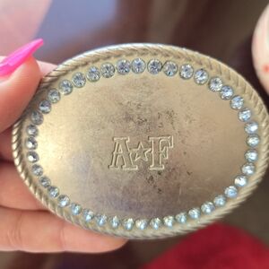 The Details: Distressed dark brown genuine leather with a massive brass-tone oval buckle featuring the classic A-star-F logo.