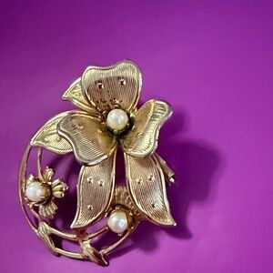 This exquisite gold floral brooch features delicate pearl accents, perfect for adding a touch of elegance to any outfit.