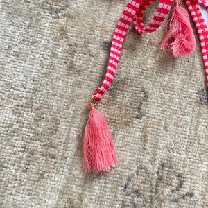 Stylish chekini bikini set with a vibrant red and pink pattern. Features tassel details on the ties.