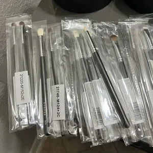 Includes various brush types for versatile application. Sleek black handles with silver accents.