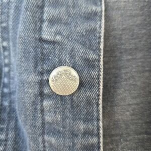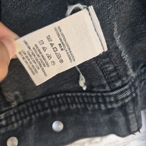 Free People Dark Blue Distressed Denim Jacket w/ Gray Knit Sleeves Hood Womens S