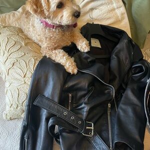 Chic black leather jacket with a classic biker design. Features zippered pockets and a belted waist. Ideal for a stylish, edgy look. Super soft lambskin I love the jacket. It just doesn’t fit me anymore. Barely worn.
