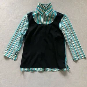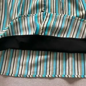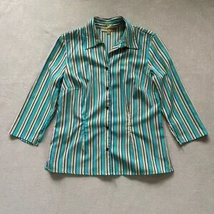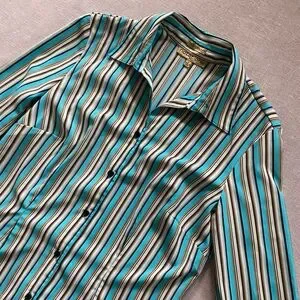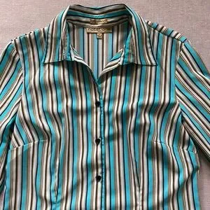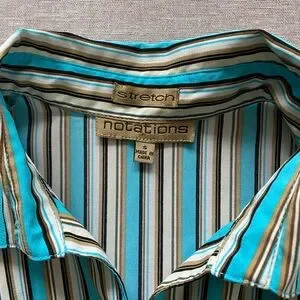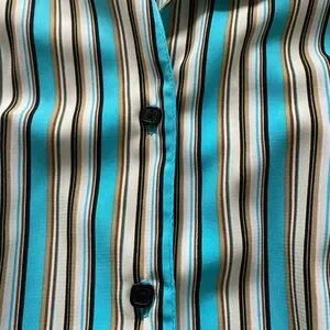 Classic late 90s, early 2000s work wear. Button up, collared style. Three quarter length sleeves. Slits on sides of hem & sleeve cuffs. Attached black camisole tank on front interior. A soft, pastel baby blue with black & shades of cream, beige, brown & tan stripes. Really cute square black buttons. Polyester & spandex. Machine wash, line dry.