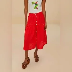FARM RIO Red Mixed Buttons Euroflax™ Premium Linen Midi Skirt