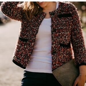 Ann Taylor Fuzzy Tweed Knit Cardigan Jacket. Size Medium. Pink. Academia. Pockets. Button down. In nice, preowned condition. No flaws noted. Measures approximately 19" pit to pit, 23" shoulder to hem.