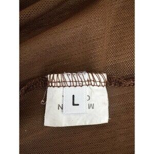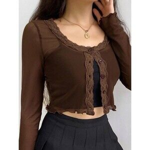 Y2K Brown Sheer Mesh Lace Trim Cropped Button Front Long Sleeve Top M Coquette