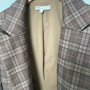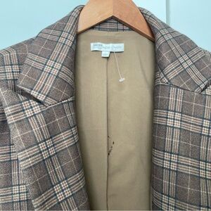 Phoebe Plaid Blazer in size Large. Double breasted brown plaid with front flap pockets. 19” across chest when buttoned closed and laying flat. Fully lined, but there is a small rip in the upper back of inner lining as pictured (not visible when worn, only on the inside). See last two photos for detail.