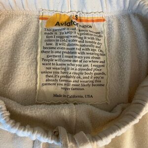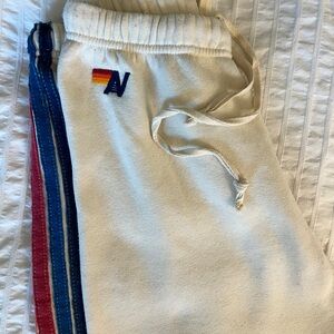 Iconic Aviator Nation joggers in an off-white/cream color with classic rainbow side stripes. Super soft fleece interior. Elastic waistband with drawstring. Elastic cuffs. Embroidered “AN” logo at hip. Made in California.