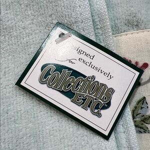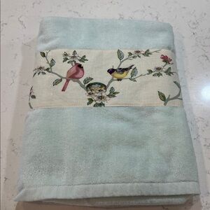 Two Collections Etc 3-Piece cotton Festive Spring Birds Towel Sets-1 in plastic packaging and 1 loose. The first photo is stock. Each side includes a hand towel, a washcloth and a large bath towel so there are six total towels. All towels have the bird design on them. Both of these towel sets were packaged, but I took one out for photos. The packaging is torn in a couple places.