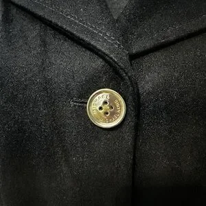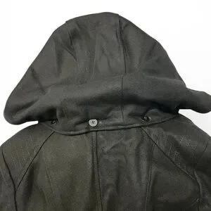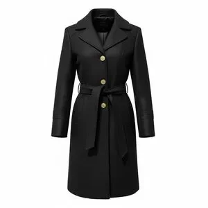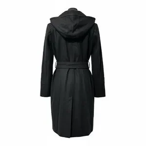 Sophisticated black hooded trench coat featuring gold buttons. Includes a belt for a refined silhouette. Perfect for a polished look. (Item#d100)