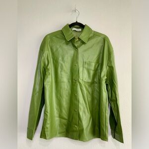 Chic olive vegan leather button down with sleek design. Features a classic collar and front pocket. Ideal for a modern look.