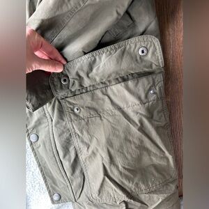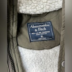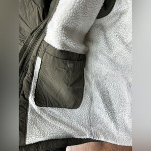 this is in amazing condition. solid warm jacket. the only reason I'm selling and may fix is bcuz when I bought this the seller failed to tell me that not only do you need a zipper pull (I found out this is super easy fix) but also the metal end part of the zipper again an easy fix. but it buttons up and like I said newsih condition with Sherpa. I'm 6'4" 220 athletic body and it is perfect.