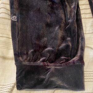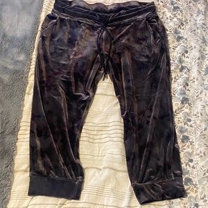 Experience comfort and style with these black velvet jogger pants. Perfect for casual outings or lounging at home. Capri length, subtle tie-dye detail and iconic Lululemon logo embroidered on lower left leg.