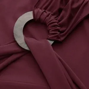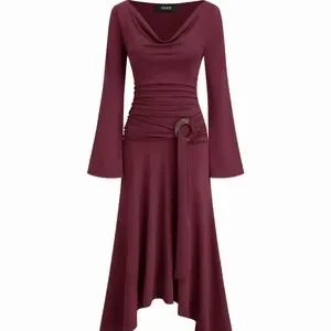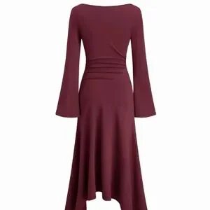 Elegant burgundy dress with a cowl neckline. Features a ruched waist and flared sleeves. Perfect for any occasion. Tag says L, fits like 8-10