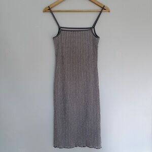 Knit midi dress. A Japanese seersucker moment. This is a square-neck midi dress with a lettuce finish at the hem. It's made from textured, Japanese seersucker with a hint of stretch for comfort.